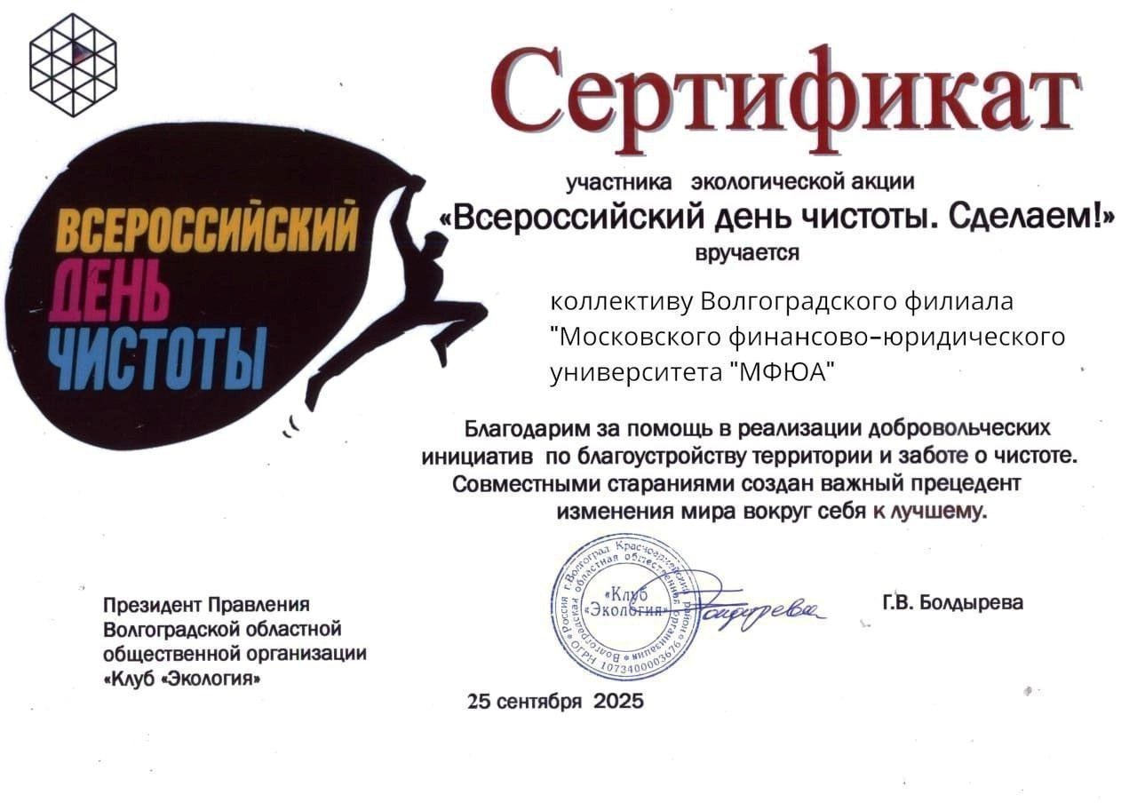 Студенты Волгоградского филиала МФЮА присоединились к масштабной экологической акции «Всероссийский день чистоты. Сделаем!».